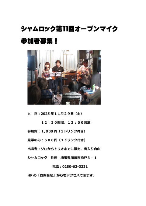 シャムロック11回目のオープンマイクを行います。 と き:2025年11月29日(日)