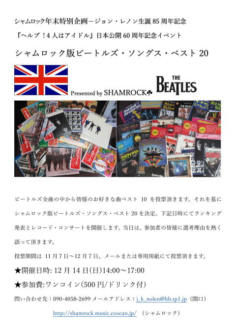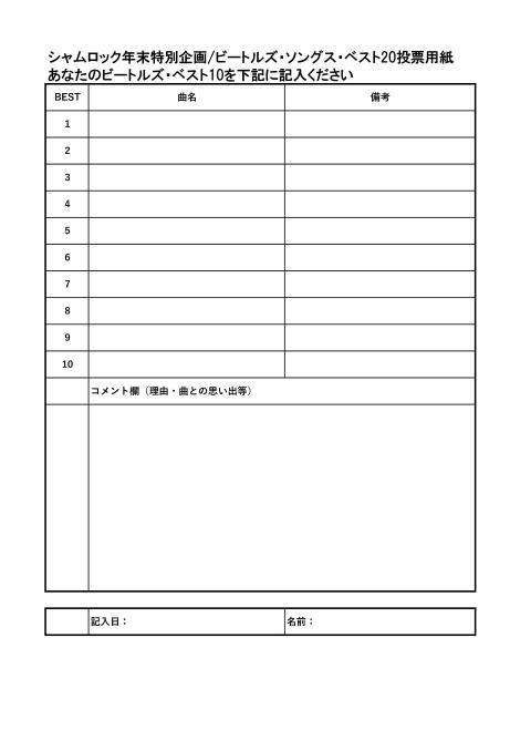 ビートルズ全曲の中からあなたの好きな曲を10曲選んで投票してください。それを集計し、シャムロック版ビートルズ・ソングス・ベスト20を決定します。 投票期間:11月7日から12月7日