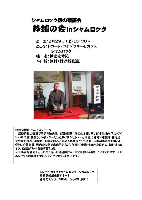 | シャムロック初の落語会☘粋鏡の会inシャムロク☘ | ||